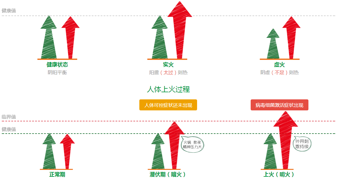 “火”是形容身體內某些熱性的癥狀。上火也就是人體陰陽失衡后出現的內熱證候,如眼睛紅腫、咽喉腫痛、牙齦腫痛、口角糜爛、便秘、尿黃等。
